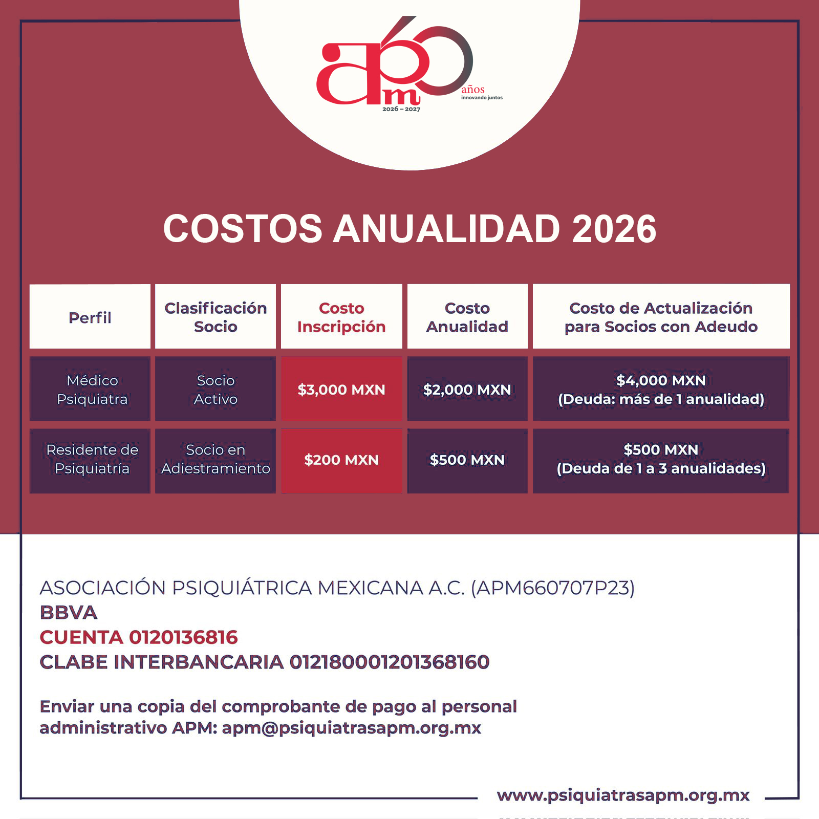 ASOCIACION PSIQUIÁTRICA MEXICANA AC (APM660707P23)CUENTA BBVA 0120136816CLABE INTERBANCARIA 012180001201368160